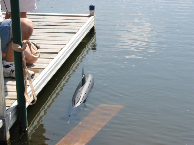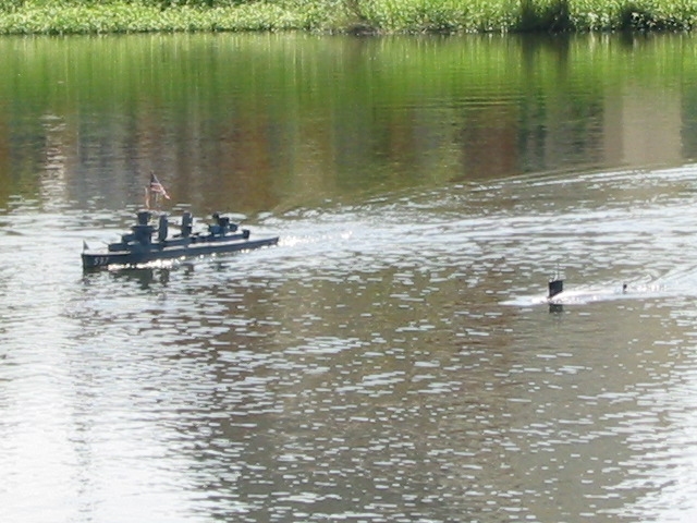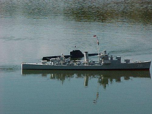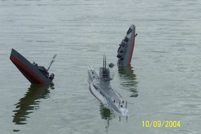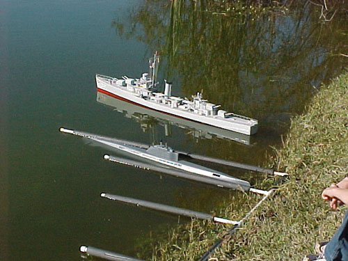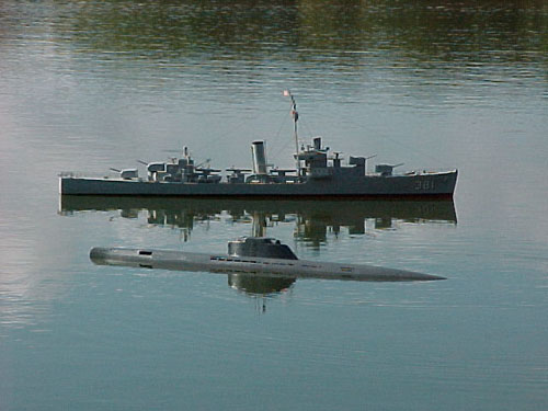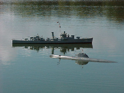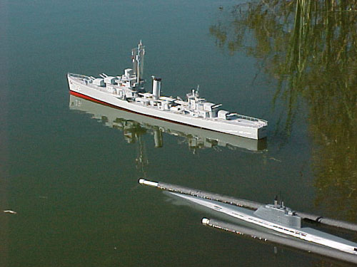 A second shot of the models close togather The Destroyer was a scratch built model of a pre-WWII type destroyer that the builder served on. The sub was a kit from a company called Rocky Mountain models. It dove and surfaced on command by a pump system with a schnorkle. If you look closely you will see the functional schnorkle in the photos. |