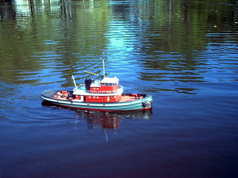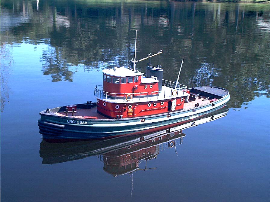 My model of the "Uncle Sam" The Uncle Sam is named after my Uncel Sam Rowley who was a tug Captain in Panama. This is a modified Scale Shipyards Carol Moran kit. It has a Dumas 12VDC motor, 3:1 Brass gear reduction drive, 1 3/4 inch brass prop, a Vantech speed controller and lights. I modified the tug by addiung a Gyro room and shortening the stack. I used several local Moran Tugs here in Jacksonville, FL as subject matter. |